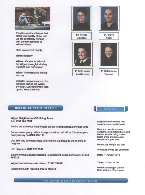 surgery held on the first Wednesday of every month in the Library in Shevington, where you can present your concerns.