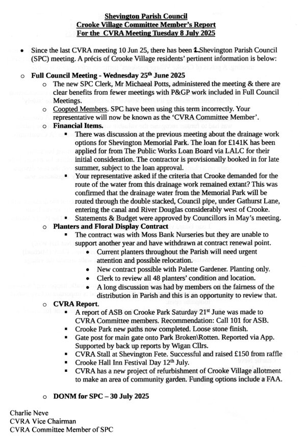 PG asked how much the raffle at the Shevington fete had made and was told by CN £150. MT said it was a good day, and the Crooke stall was well attended. A